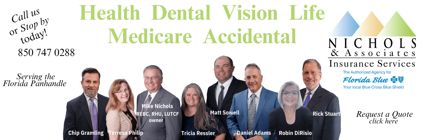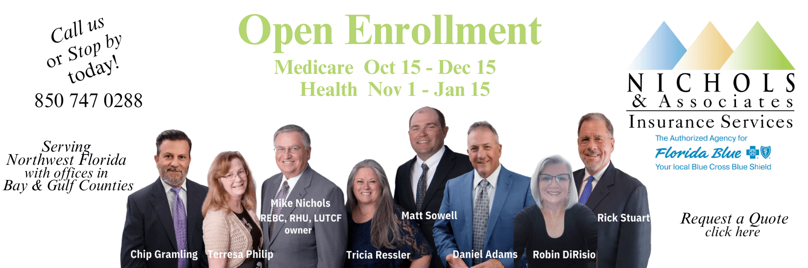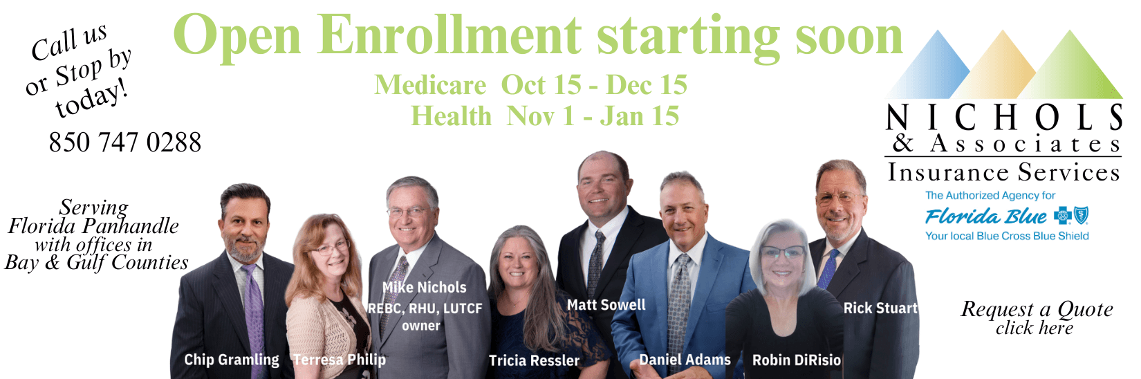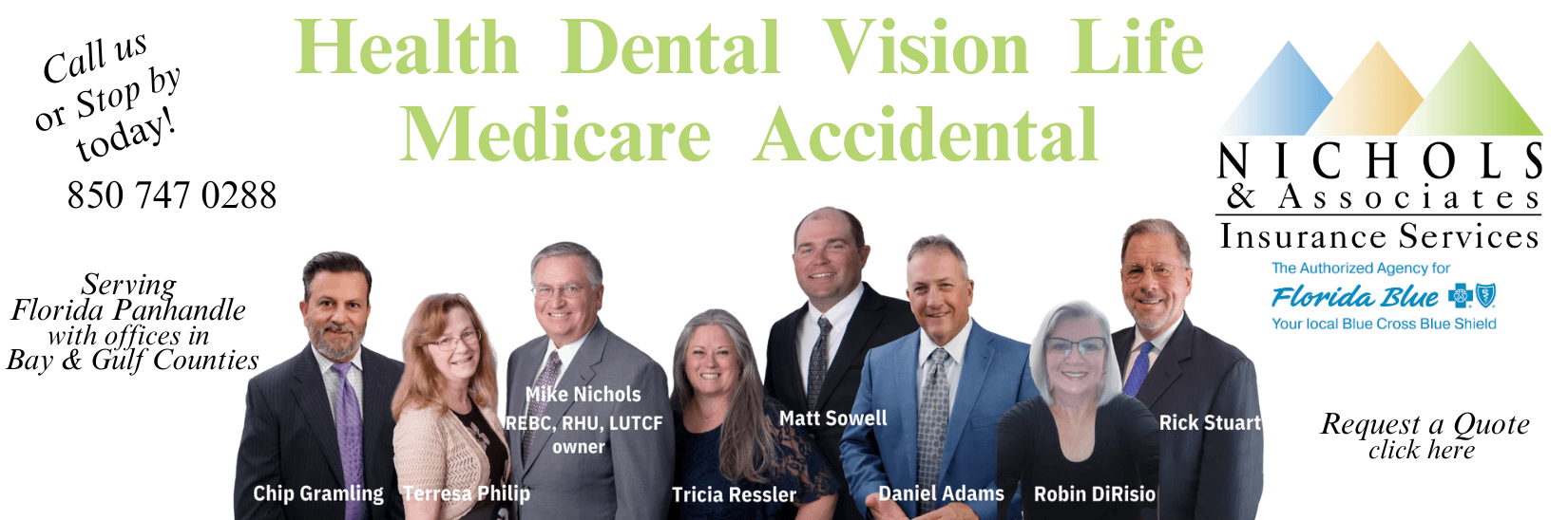 At Nichols & Associates, we help individuals, families, and businesses find the right insurance coverage for their needs and budget. As an authorized Florida Blue agency, we specialize in health, Medicare, dental, life, and disability insurance. With offices in Panama City and Port St. Joe, we proudly serve the Florida Panhandle, including Bay County and Gulf County.